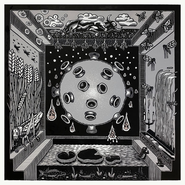 Linoprint “de elfde plaag”, met daarin de 10 plagen en het coronavirus als elfde plaag.